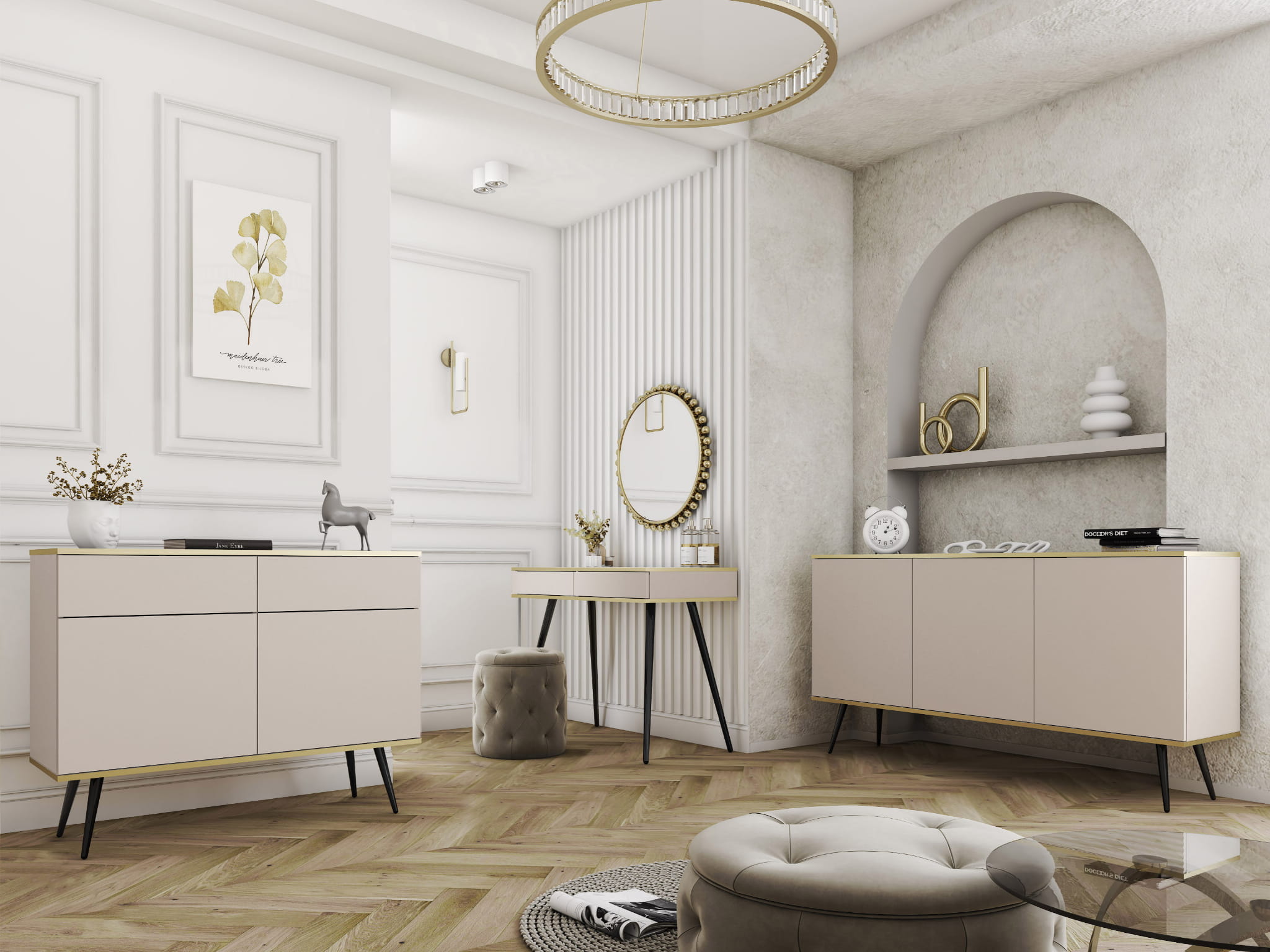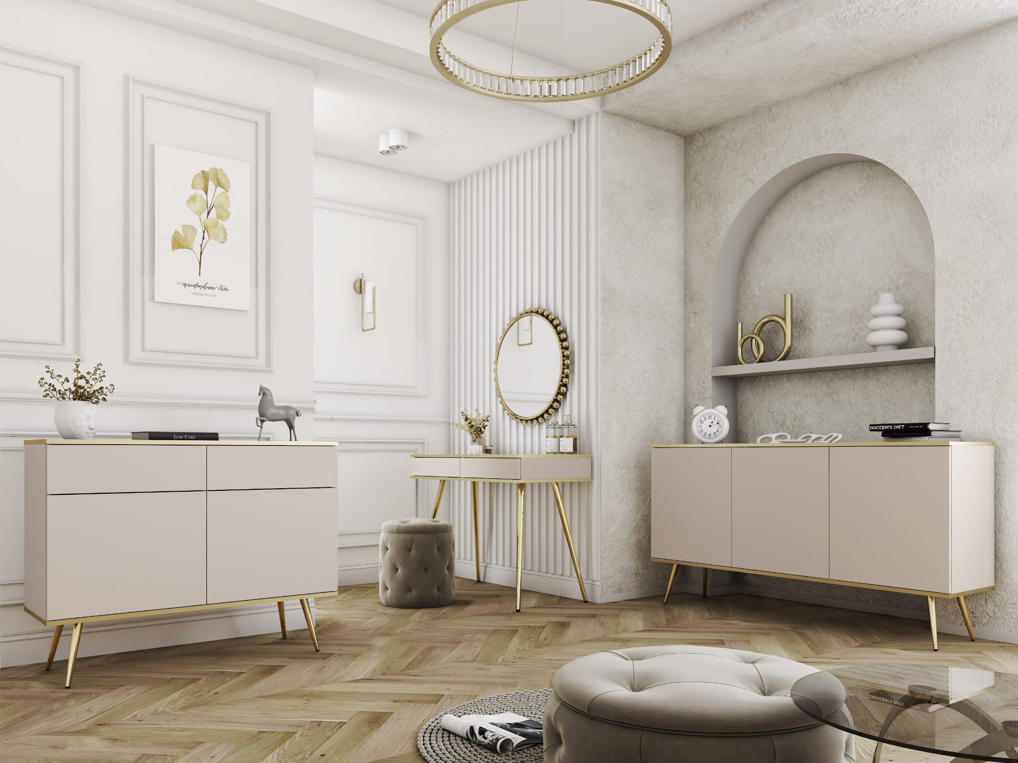 Beżowa komoda szeroka LORO to kwintesencja subtelnej elegancji i funkcjonalności. Ciepły odcień beżu, w połączeniu ze złotymi detalami, tworzy harmonijną całość, która nadaje wnętrzu przytulności i stylu. Dzięki swojej szerokiej formie oraz pojemnym szufladom, komoda doskonale sprawdzi się do przechowywania odzieży, dokumentów czy innych przedmiotów codziennego użytku. To mebel, który nie tylko spełnia praktyczne potrzeby, ale również wprowadza do pomieszczenia wyjątkowy, luksusowy charakter.
