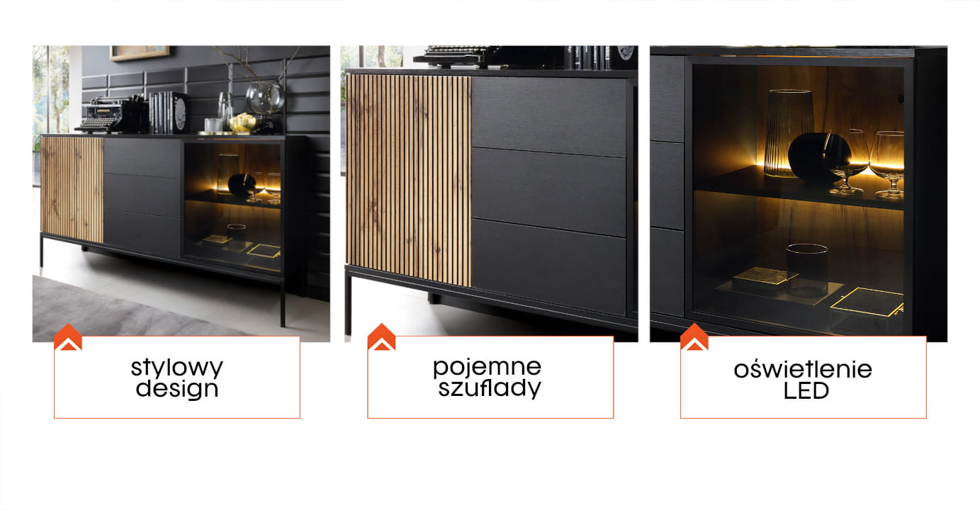 Komoda SIENTO to mebel stworzony z myślą o potrzebach użytkowników. Dzięki dwóm drzwiczkom i szufladom zapewnia wystarczającą ilość miejsca do przechowywania różnych przedmiotów codziennego użytku. Komoda jest dostępna w eleganckim połączeniu kolorystycznym czarnego grafitu z dębem wotan, co nadaje wnętrzu nowoczesnego charakteru, doskonale komponując się z różnymi aranżacjami. Dzięki temu, utrzymywanie porządku w salonie staje się łatwiejsze, a wszystkie niezbędne rzeczy są zawsze pod ręką.
