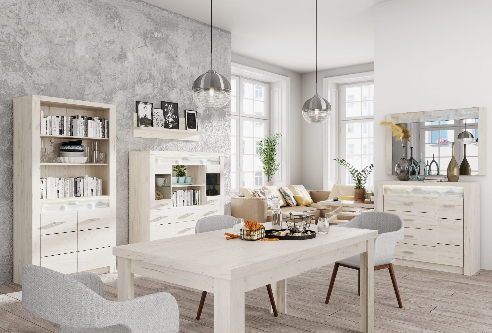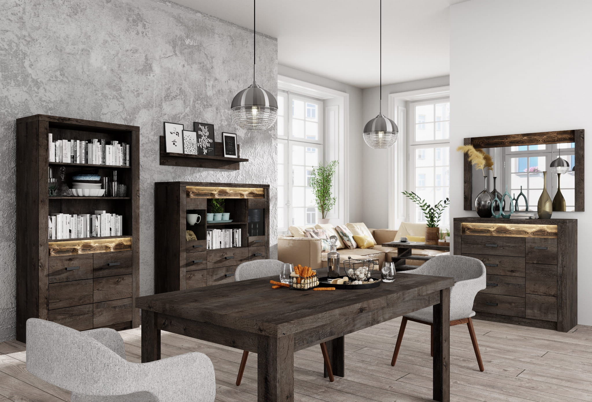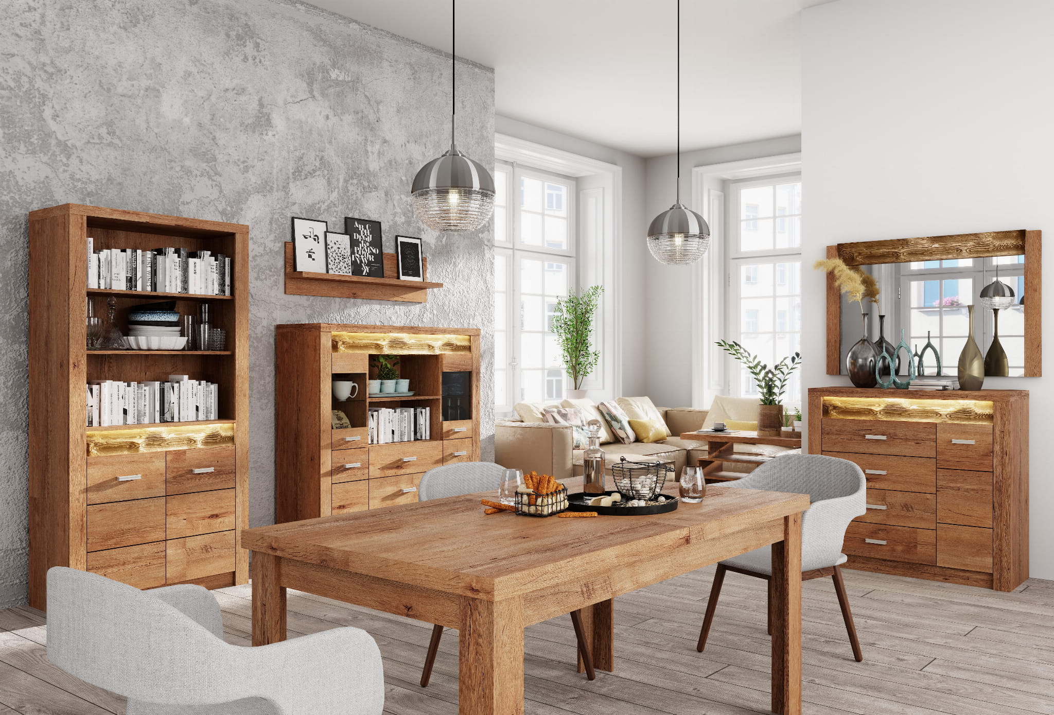 INDIANA to kolekcja mebli o stylowym designie w trzech wariantach kolorystycznych: kraft biały oraz jesion jasny i ciemny. Oświetlenie LED oraz starannie wykonane wyżłobienia w drewnie nadają tej kolekcji niepowtarzalnego charakteru. Meble z tej kolekcji idealnie wkomponują się do Twojego wnętrza.