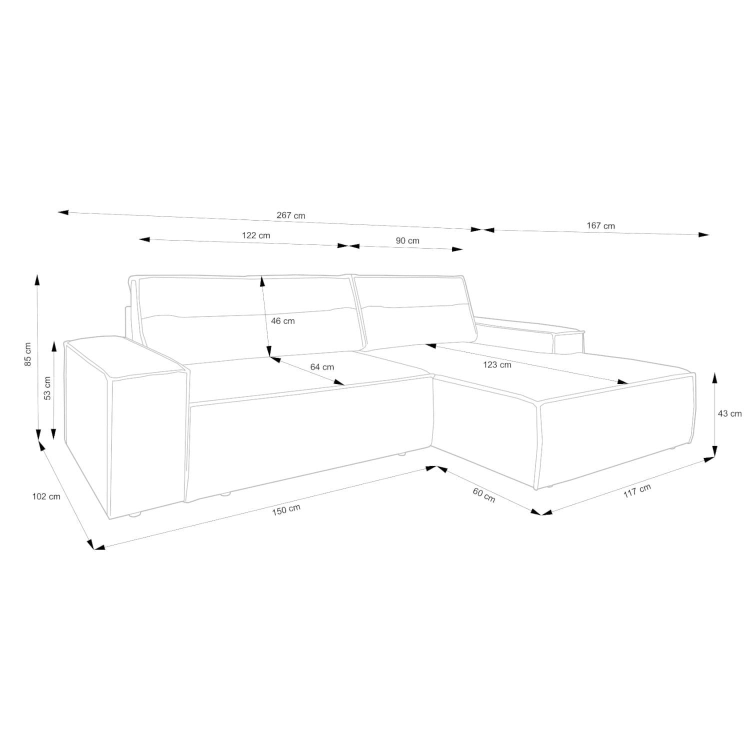 - szer. 267 / wys. 85 / gł. 167 / wys. siedziska 43 cm