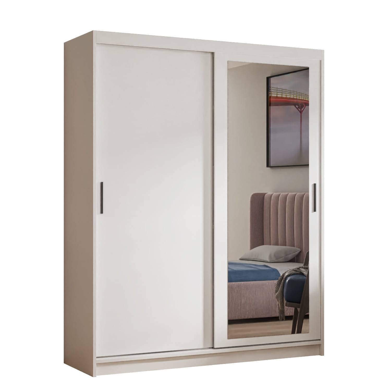Szafa przesuwna HANIA 180 w białym kolorze to kwintesencja elegancji i prostoty. Śnieżnobiała powierzchnia doskonale rozświetla wnętrze, nadając mu nowoczesnego i przestronnego charakteru. Centralnie umieszczone lustro dodatkowo optycznie powiększa przestrzeń, sprawiając, że pomieszczenie staje się jaśniejsze i bardziej przytulne. Przesuwane drzwi zapewniają oszczędność miejsca, co czyni szafę idealnym rozwiązaniem nawet w mniejszych pomieszczeniach. Dzięki praktycznemu układowi półek i drążka na ubrania, uporządkowanie garderoby stanie się wyjątkowo proste. Ta wersja szafy idealnie pasuje do wnętrz urządzonych w stylu skandynawskim lub minimalistycznym, łącząc estetykę z funkcjonalnością.
