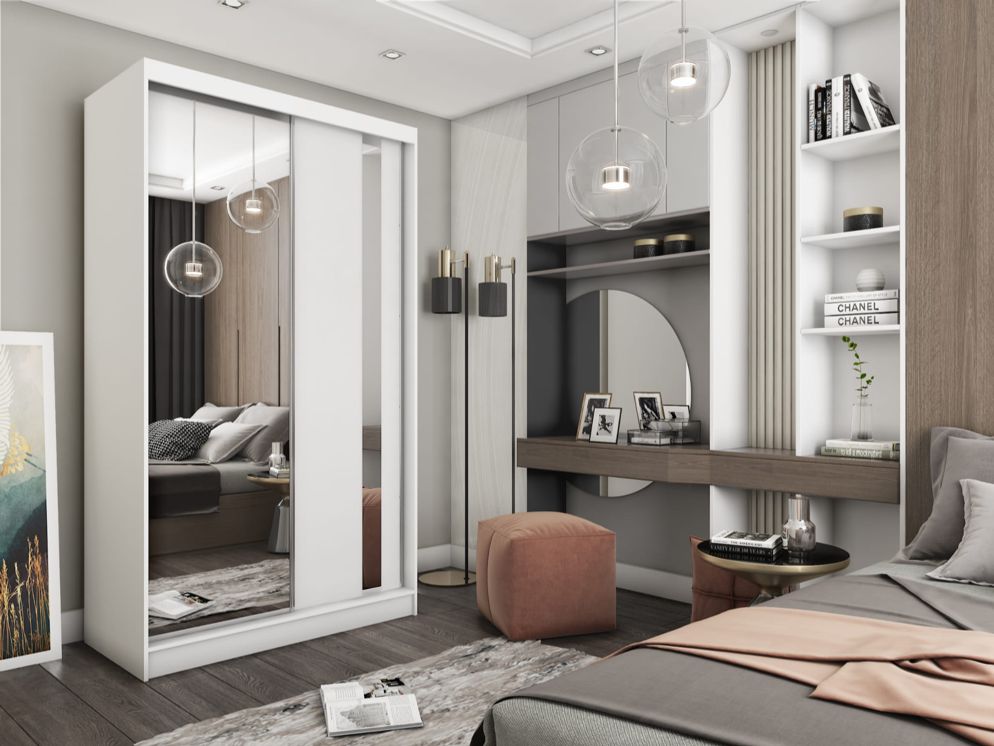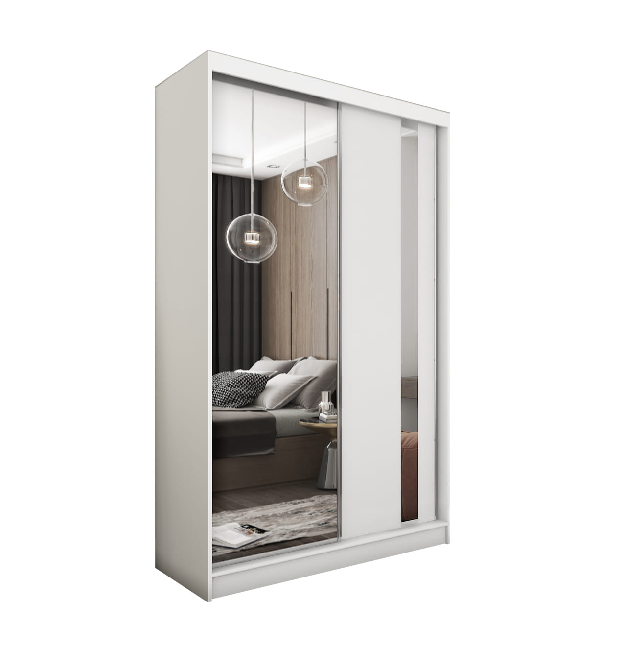Szafa GAJA 120 cm w kolorze biały mat to świetny wybór dla miłośników jasnych, minimalistycznych wnętrz. Matowa biel nadaje meblowi elegancji, a duże lustro optycznie powiększa i rozjaśnia pomieszczenie. Dzięki temu wariantowi kolorystycznemu, szafa idealnie wpisuje się w nowoczesne aranżacje, wnosząc do Twojej sypialni lub przedpokoju świeżość i przestronność.
