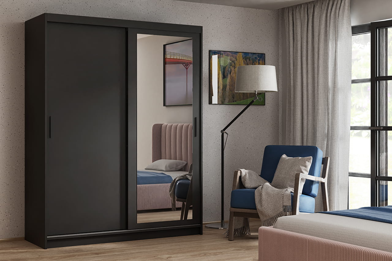 Postaw na funkcjonalny minimalizm z szafą HANIA 180 w czerni. Przesuwne drzwi, duże lustro i loftowy charakter to połączenie stylu i wygody.