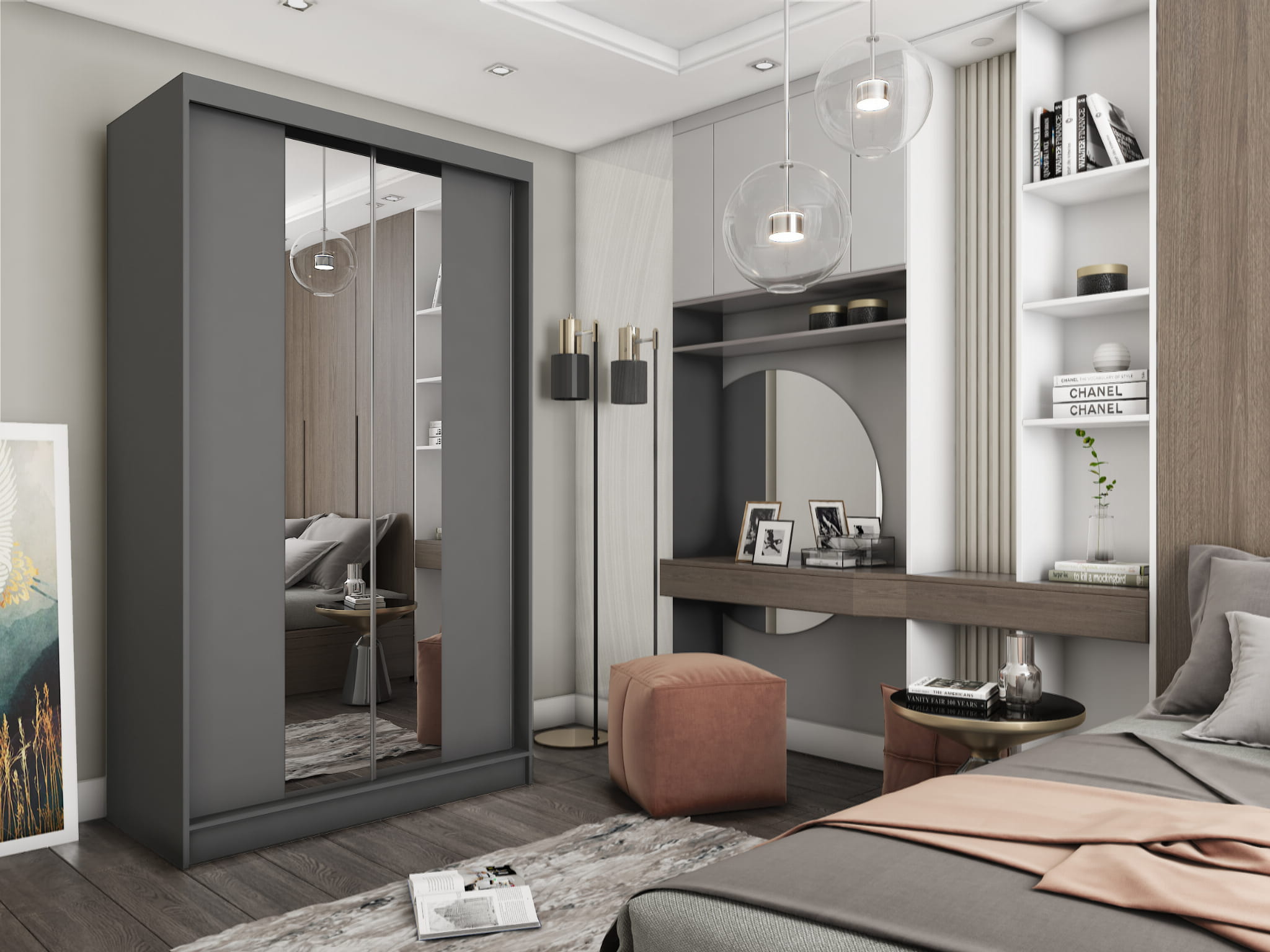 Zamów LIZĘ 150 cm i dodaj wnętrzu elegancji w nowoczesnym stylu. Grafit i lustro tworzą efektowną całość, która sprawdzi się nawet w mniejszej przestrzeni.