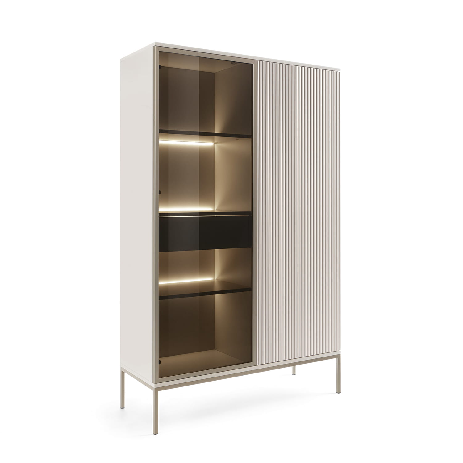W skład zestawu wchodzą m.in. witryny oraz szafka RTV – wszystkie utrzymane w tym samym stylu i kolorystyce, co pozwala na stworzenie spójnego, estetycznego wnętrza. Każdy mebel oferuje praktyczne miejsce do przechowywania lub ekspozycji, jednocześnie pełniąc funkcję dekoracyjną.
