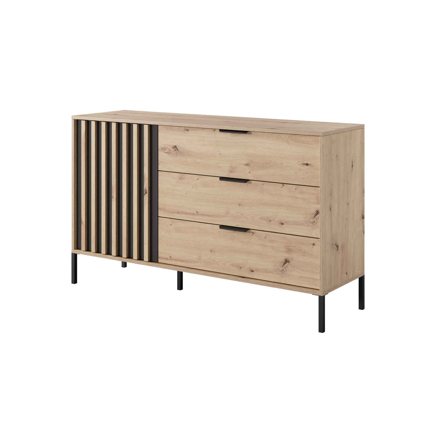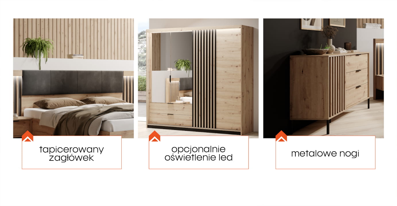 Przywitaj elegancję i funkcjonalność w swojej sypialni dzięki kolekcji mebli TALLIO. Stworzone z solidnej płyty laminowanej o grubości 16 mm, te meble w kolorach dąb artisan i antracyt stanowią doskonałe połączenie wyjątkowego designu i trwałej konstrukcji. Każdy element kolekcji został starannie zaprojektowany, aby zapewnić nie tylko estetyczny wygląd, ale także wygodę i praktyczność. Opcjonalne oświetlenie LED dostępne dla szafy i stolików nocnych tworzy przyjemną atmosferę, idealną do relaksu po długim dniu. Tapicerowany zagłówek w łóżku dodaje elegancji i zapewnia wsparcie dla komfortowego wypoczynku, podczas gdy pojemnik na pościel umożliwia przechowywanie rzeczy w zasięgu ręki, ale poza widokiem. Precyzyjnie wykonane prowadnice szuflad kulkowych gwarantują płynne otwieranie i zamykanie, a zawiasy wpuszczane lub bliźniacze dodają elegancji i nadają meblom nowoczesnego wyglądu. Metalowe nogi w kolorze czarnym oraz matowy metalowy uchwyt podkreślają charakter kolekcji TALLIO, nadając jej wyrafinowanego i współczesnego stylu, który z pewnością ozdobi Twoją sypialnię.
